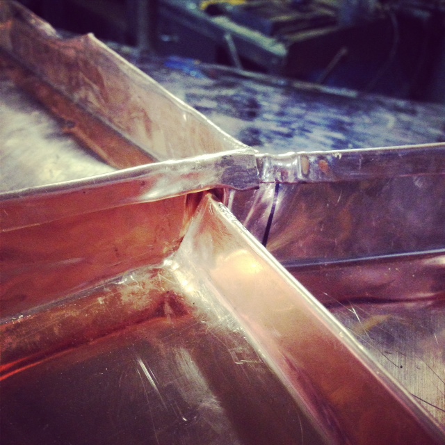 The great thing about tin-knocking and hand seaming is: any surface that has a pitch can be clad and seamed through without the use of soldering. Double locked, standing seams when properly executed can be carried through almost any complicated detail on a roof: again without the use of solder, petrochemical sealants, or any other magic goop or temporary methods.
