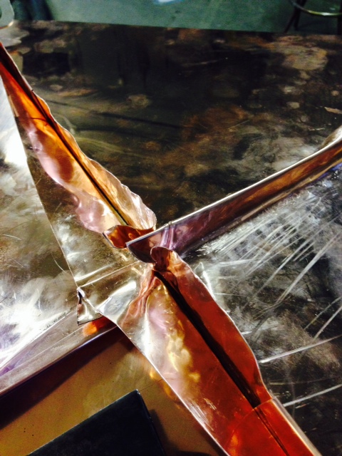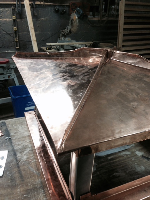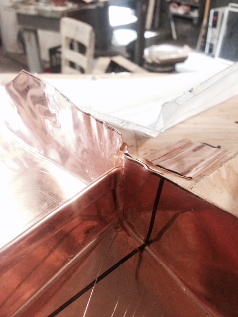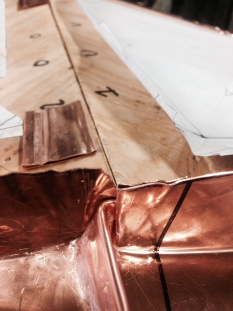 We start by laying out the pans. This pan was laid out from the plywood template. The same geometry used to calculate the triangles for the irregular roof are used to form the copper pans. Of course I have to add more material for the seams but the bend line is essentially the same as the plywood seam.