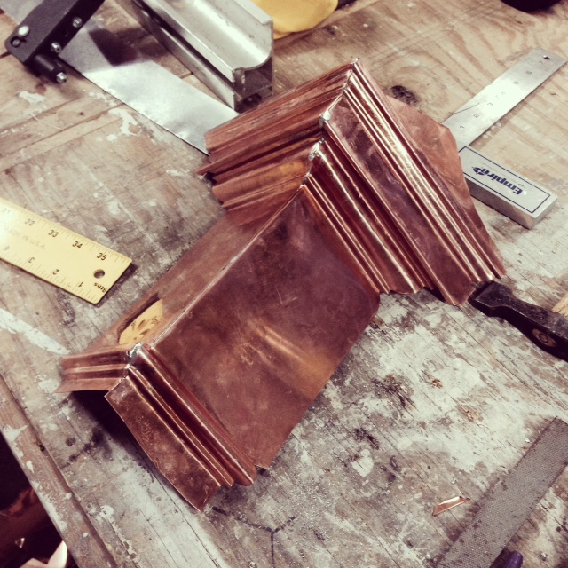 This week we are fabricating some custom leader heads and custom downspouts for a client on University Ave. The home was architect-designed and built in 1921. These leader heads are original and they were pretty banged up.