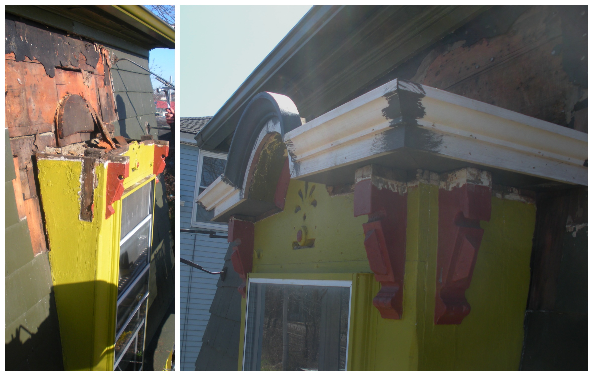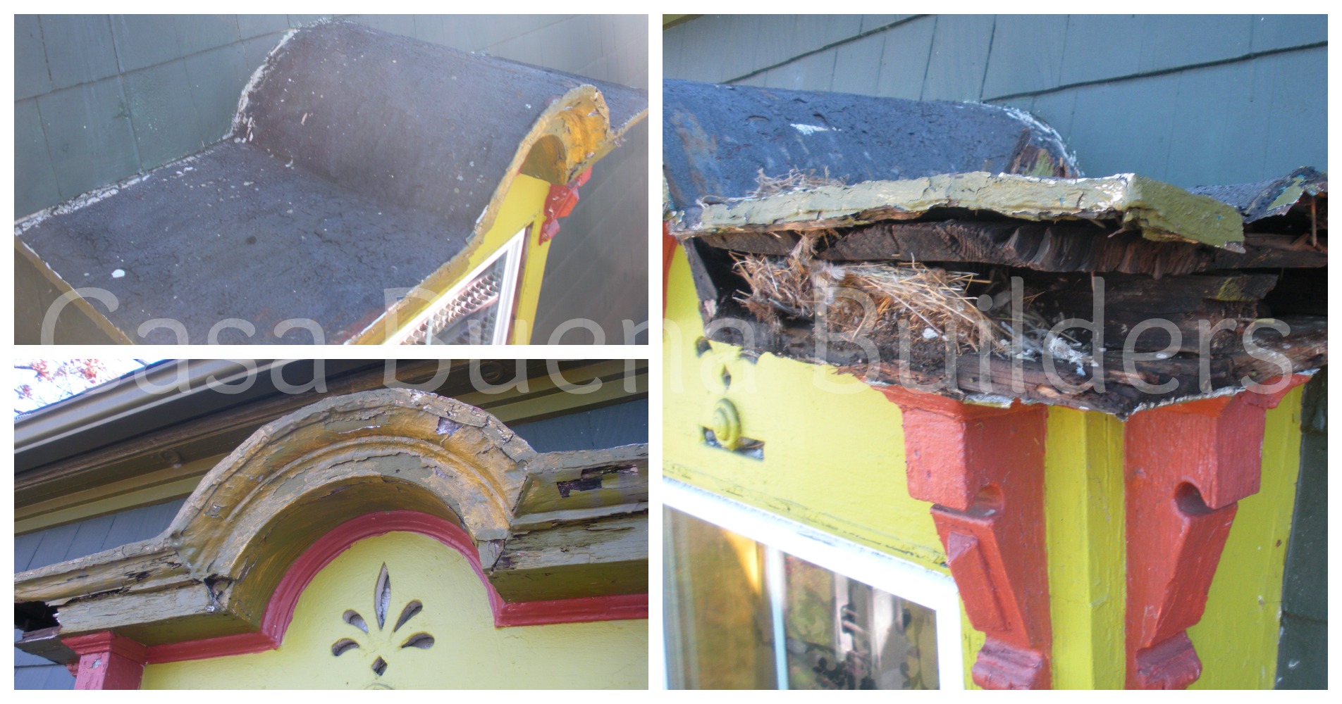 Here is the initial condition of the dormer. Wood is rotting, and birds have made their nest.