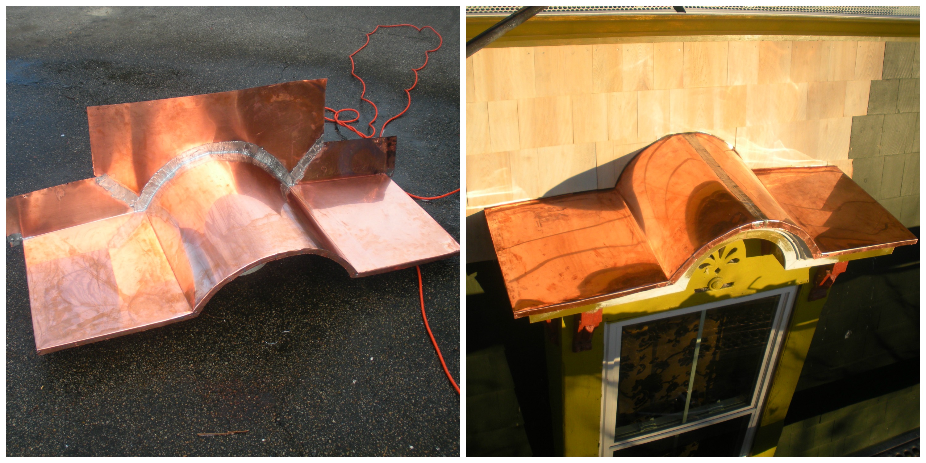 While the cost for a rubber roof verses a copper roof would be significantly less (nearly one-third the cost), the durability of copper is much greater; 16 oz. copper (as in the roof above) will last more than 70 years, while rubber would last in the 12-15 year range.