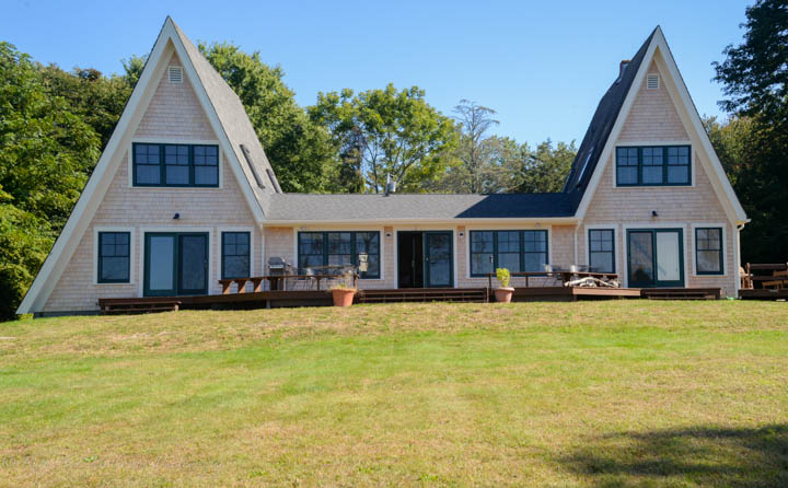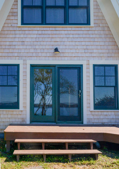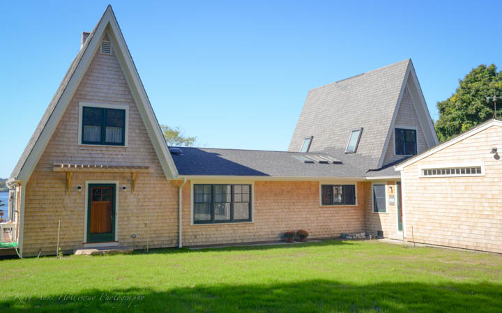 In addition to re-shingling (new siding),  new windows and doors were installed in new locations to improve the symmetry of the building. New exterior lighting was also installed, simple fixtures were chosen.